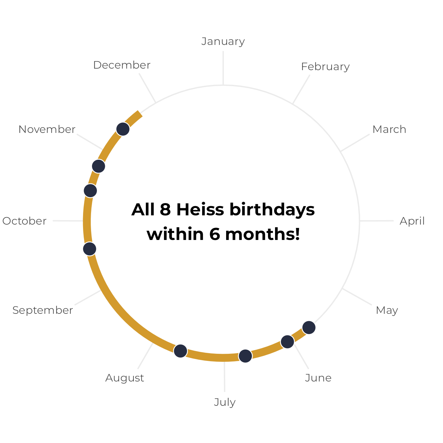 Or check out this plot showing how the eight birthdays in my family all fall within a six-month span (which is surprisingly uncommon! If you look at the full post, you’ll find that there’s only a 6.5% chance of that happening in an eight-person household!)