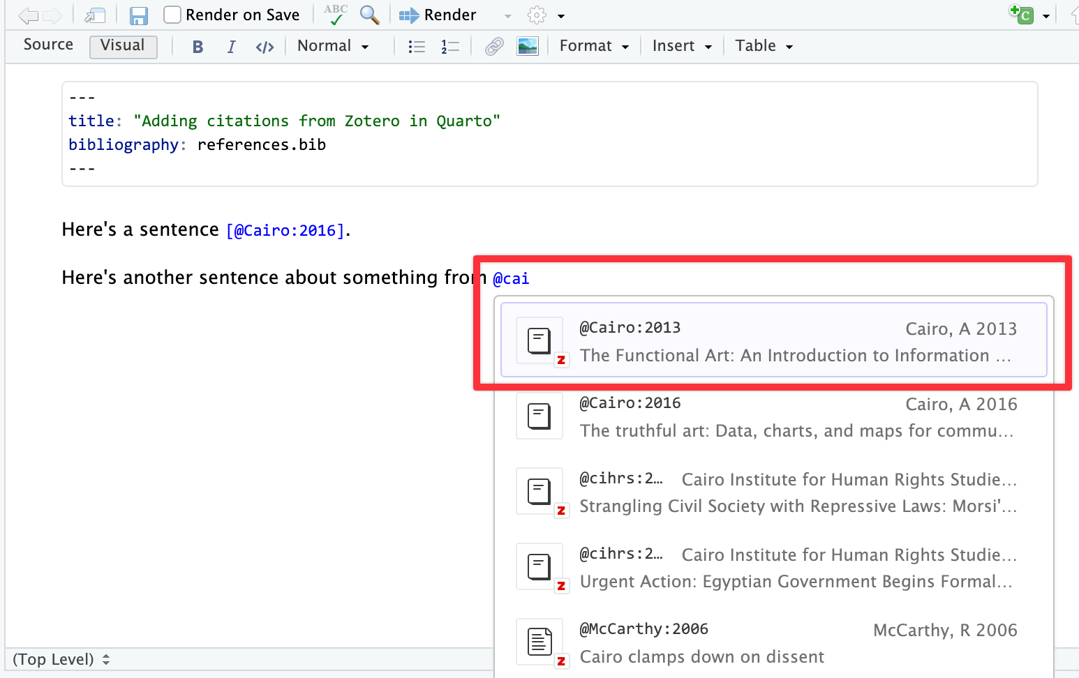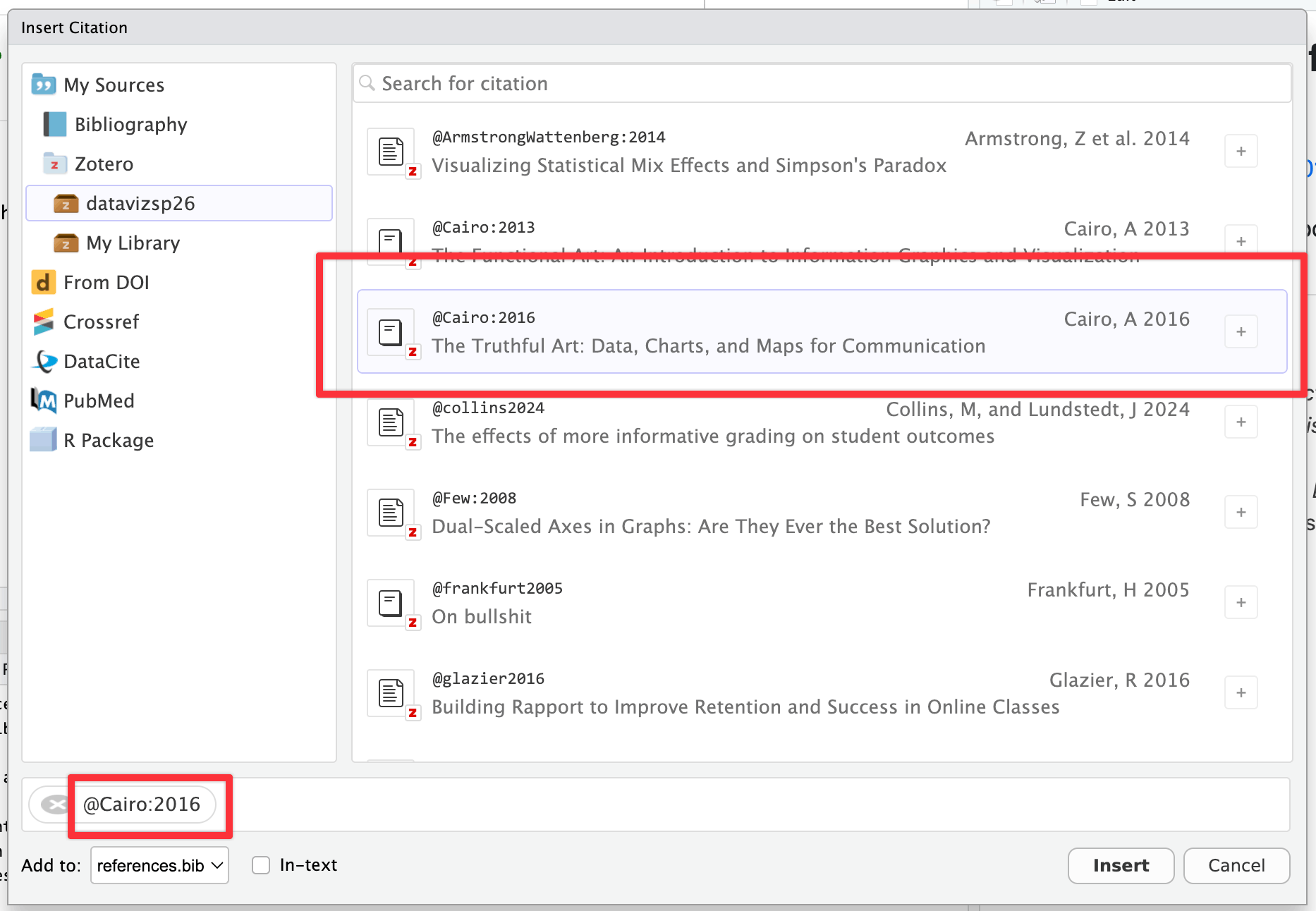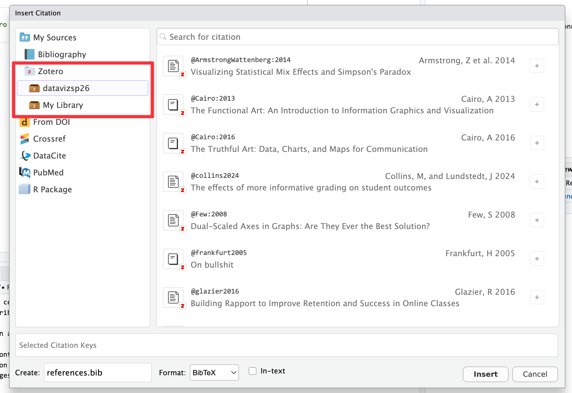 You can use these references in your Quarto documents directly in RStudio! You need to set up a few things first, but then it’s straightforward to get automatic citations in your documents. You can also see the official Quarto documentation for citations in general and the RStudio documentation (and this blog post) for working with citations in RStudio.