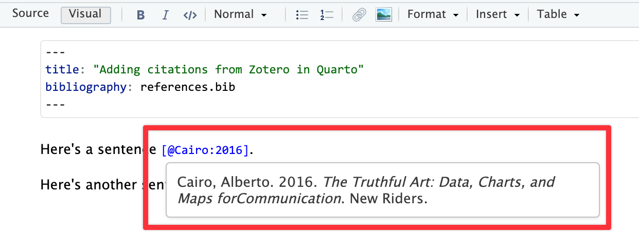 Once the citation key is inserted, you can hover over it in your .qmd file and see a preview of it: