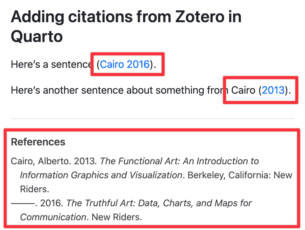 More importantly, when you render the document to HTML, PDF, Word, or whatever format you’re using, you’ll have the correct citation and an automatic list of references: