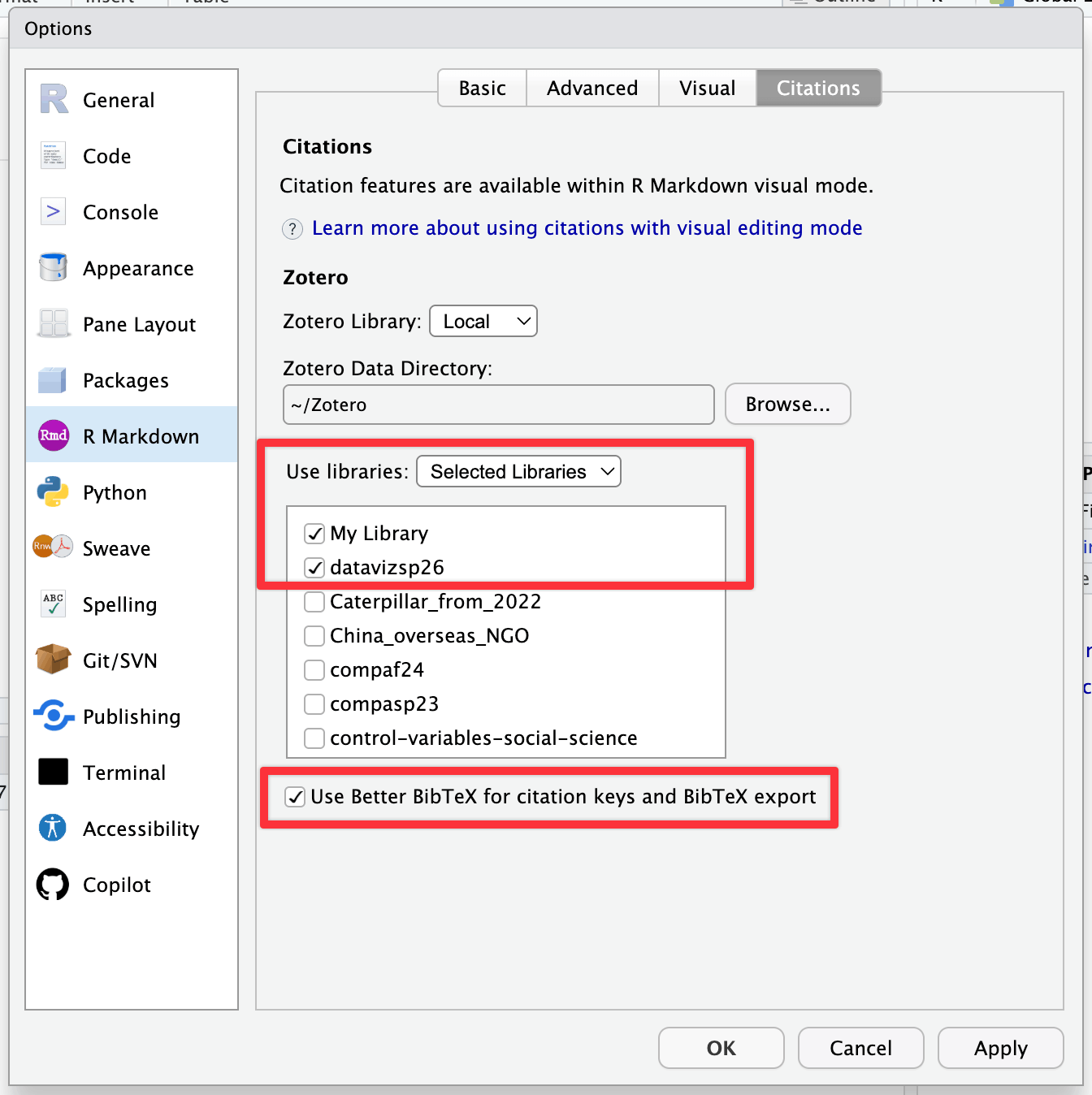 Next, we need to tell RStudio that (1) Zotero exists and that (2) it should look at both your main local library and the shared class group.