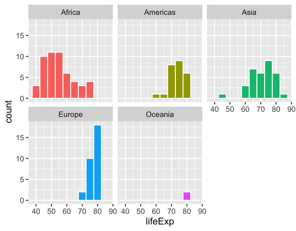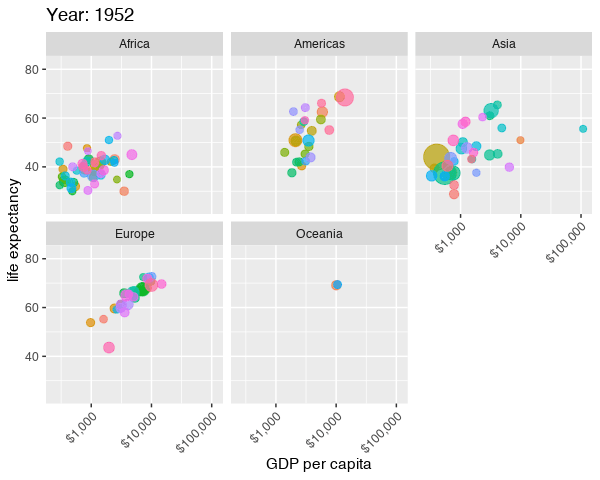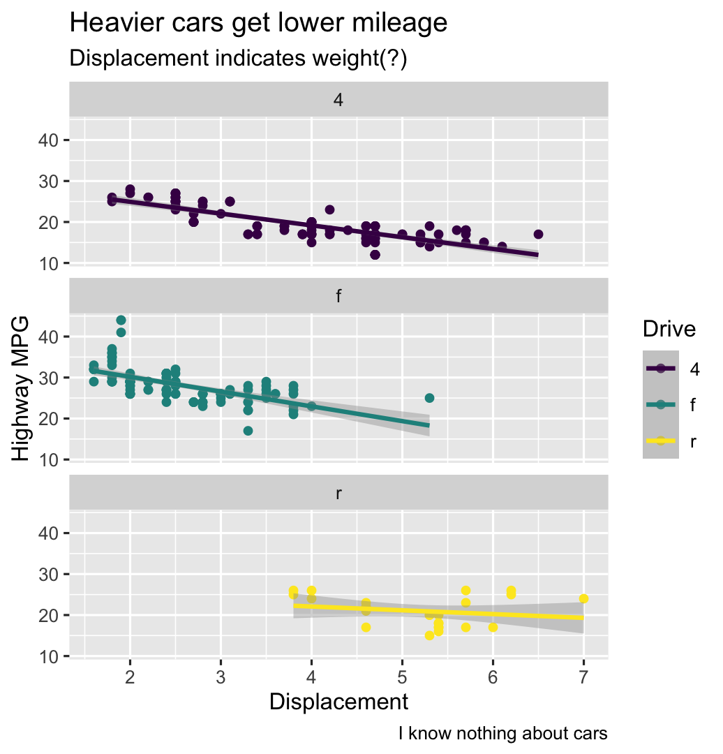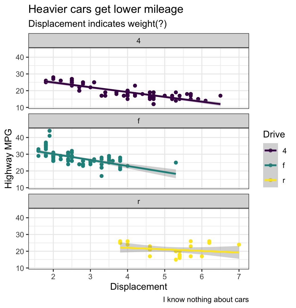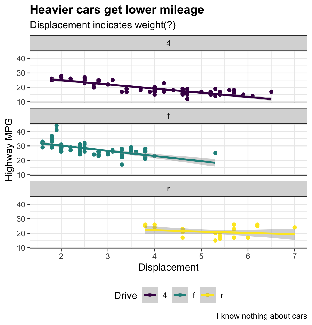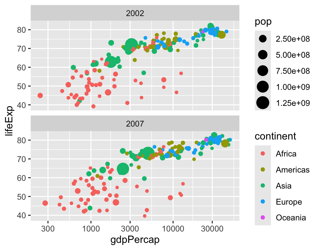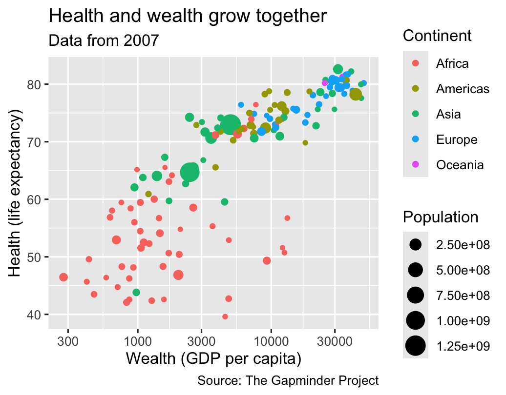 class: center middle main-title section-title-4 # Mapping Data<br>to Graphics .class-info[ **Session 3** .light[PMAP 8551/4551: Data Visualization with R<br> Andrew Young School of Policy Studies<br> Spring 2026] ] --- name: outline class: title title-inv-7 # Plan for today -- .box-4.medium.sp-after-half[Data, aesthetics, & the grammar of graphics] -- .box-2.medium.sp-after-half[Grammatical layers] -- .box-3.medium.sp-after-half[Aesthetics in extra dimensions] -- .box-6.medium[Tidy data] --- name: grammar-of-graphics class: center middle section-title section-title-4 animated fadeIn # Data, aesthetics,<br>& the grammar of graphics --- class: bg-full bg-y-75 background-image: url("img/03/napoleon-retreat.jpg") ??? Source: [Wikipedia](https://en.wikipedia.org/wiki/File:National_Museum_in_Poznan_-_Przej%C5%9Bcie_przez_Berezyn%C4%99.JPG) --- layout: true class: title title-4 --- # Long distance! .center[ <figure> <img src="img/03/napoleon-google-maps.png" alt="Moscow to Vilnius" title="Moscow to Vilnius" width="80%"> <figcaption>Moscow to Vilnius</figcaption> </figure> ] --- # Very cold! <img src="03-slides_files/figure-html/minard-temps-1.png" width="864" style="display: block; margin: auto;" /> --- # Lots of people died! <img src="03-slides_files/figure-html/minard-deaths-1.png" width="468" style="display: block; margin: auto;" /> --- layout: false class: bg-full background-image: url("img/03/minard.png") ??? Source: [Wikimedia Commons](https://upload.wikimedia.org/wikipedia/commons/2/29/Minard.png) --- layout: true class: title title-4 --- # Mapping data to aesthetics .pull-left.center[ <figure> <img src="img/03/gg-book.jpg" alt="ZZZ" title="ZZZ" width="55%"> </figure> ] .pull-right[ .box-inv-4.medium[Aesthetic] .box-4[Visual property of a graph] .box-4.sp-after[Position, shape, color, etc.] .box-inv-4.medium[Data] .box-4[A column in a dataset] ] --- # Mapping data to aesthetics <table> <tr> <th class="cell-left">Data</th> <th class="cell-left">Aesthetic</th> <th class="cell-left">Graphic/Geometry</th> </tr> <tr> <td class="cell-left">Longitude</td> <td class="cell-left">Position (x-axis) </td> <td class="cell-left">Point</td> </tr> <tr> <td class="cell-left">Latitude</td> <td class="cell-left">Position (y-axis)</td> <td class="cell-left">Point</td> </tr> <tr> <td class="cell-left">Army size</td> <td class="cell-left">Size</td> <td class="cell-left">Path</td> </tr> <tr> <td class="cell-left">Army direction </td> <td class="cell-left">Color</td> <td class="cell-left">Path</td> </tr> <tr> <td class="cell-left">Date</td> <td class="cell-left">Position (x-axis)</td> <td class="cell-left">Line + text</td> </tr> <tr> <td class="cell-left">Temperature</td> <td class="cell-left">Position (y-axis)</td> <td class="cell-left">Line + text</td> </tr> </table> --- # Mapping data to aesthetics <table> <tr> <th class="cell-left">Data</th> <th class="cell-left"><code class="remark-inline-code">aes()</code></th> <th class="cell-left"><code class="remark-inline-code">geom</code></th> </tr> <tr> <td class="cell-left">Longitude</td> <td class="cell-left"><code class="remark-inline-code">x</code></td> <td class="cell-left"><code class="remark-inline-code">geom_point()</code></td> </tr> <tr> <td class="cell-left">Latitude</td> <td class="cell-left"><code class="remark-inline-code">y</code></td> <td class="cell-left"><code class="remark-inline-code">geom_point()</code></td> </tr> <tr> <td class="cell-left">Army size</td> <td class="cell-left"><code class="remark-inline-code">size</code></td> <td class="cell-left"><code class="remark-inline-code">geom_path()</code></td> </tr> <tr> <td class="cell-left">Army direction </td> <td class="cell-left"><code class="remark-inline-code">color</code> </td> <td class="cell-left"><code class="remark-inline-code">geom_path()</code></td> </tr> <tr> <td class="cell-left">Date</td> <td class="cell-left"><code class="remark-inline-code">x</code></td> <td class="cell-left"><code class="remark-inline-code">geom_line() + geom_text()</code></td> </tr> <tr> <td class="cell-left">Temperature</td> <td class="cell-left"><code class="remark-inline-code">y</code></td> <td class="cell-left"><code class="remark-inline-code">geom_line() + geom_text()</code></td> </tr> </table> --- # `ggplot()` template -- --- layout: false .box-4[This is a dataset named `troops`:] .small[ <table> <thead> <tr> <th style="text-align:left;"> longitude </th> <th style="text-align:left;"> latitude </th> <th style="text-align:left;"> direction </th> <th style="text-align:left;"> survivors </th> </tr> </thead> <tbody> <tr> <td style="text-align:left;"> 24 </td> <td style="text-align:left;"> 54.9 </td> <td style="text-align:left;"> A </td> <td style="text-align:left;"> 340000 </td> </tr> <tr> <td style="text-align:left;"> 24.5 </td> <td style="text-align:left;"> 55 </td> <td style="text-align:left;"> A </td> <td style="text-align:left;"> 340000 </td> </tr> <tr> <td style="text-align:left;"> … </td> <td style="text-align:left;"> … </td> <td style="text-align:left;"> … </td> <td style="text-align:left;"> … </td> </tr> </tbody> </table> ] -- --- <img src="03-slides_files/figure-html/show-basic-minard-1.png" width="100%" style="display: block; margin: auto;" /> --- class: bg-full background-image: url("img/03/rosling-tedx.jpg") ??? Source: [New York Times](https://www.nytimes.com/2017/02/09/world/europe/hans-rosling-dead-statistician.html) --- class: bg-full background-image: url("img/03/gapminder-screenshot.png") ??? Source: [Gapminder](https://www.gapminder.org/tools/#$chart-type=bubbles) --- layout: true class: title title-4 --- # Mapping data to aesthetics <table> <tr> <th class="cell-left">Data</th> <th class="cell-left"><code class="remark-inline-code">aes()</code></th> <th class="cell-left"><code class="remark-inline-code">geom</code></th> </tr> <tr> <td class="cell-left">Wealth (GDP/capita)</td> <td class="cell-left"><code class="remark-inline-code">x</code></td> <td class="cell-left"><code class="