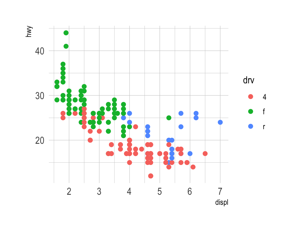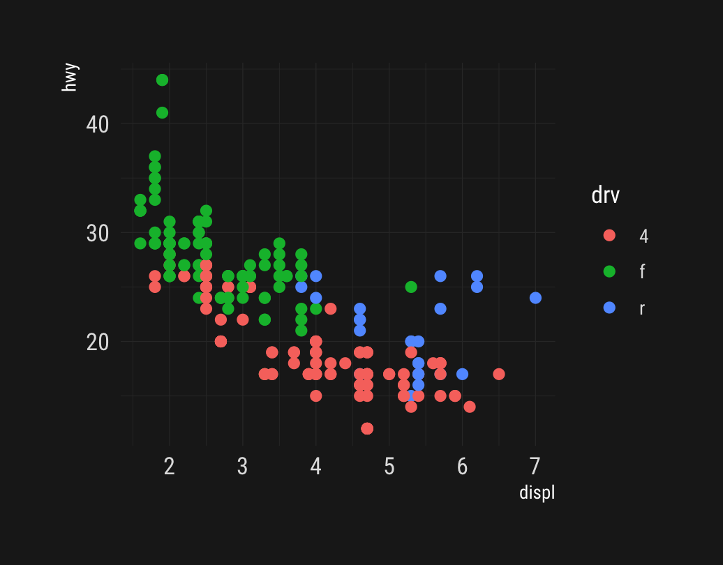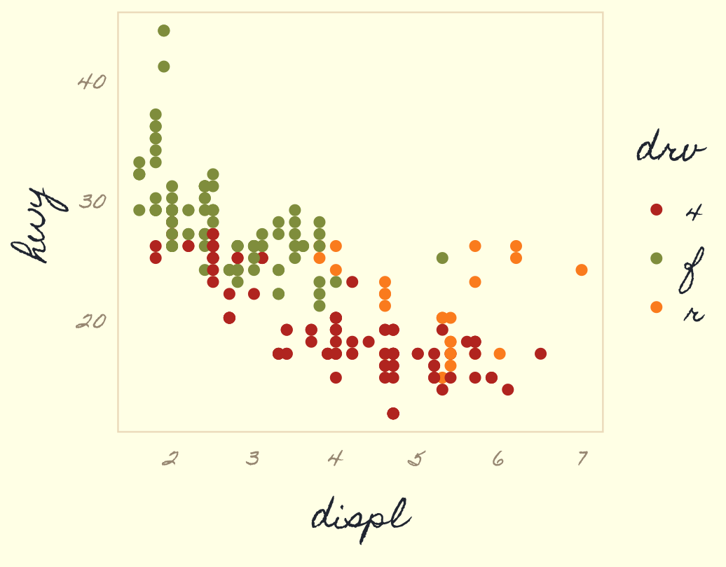class: center middle main-title section-title-4 # Themes .class-info[ **Session 5** .light[PMAP 8551/4551: Data Visualization with R<br> Andrew Young School of Policy Studies<br> Spring 2026] ] --- name: outline class: title title-inv-7 # Plan for today -- .box-5.medium.sp-after-half[CRAP and ggplot] -- .box-6.medium.sp-after-half[The anatomy of a ggplot theme] --- name: crap-ggplot class: center middle section-title section-title-5 animated fadeIn # CRAP and ggplot --- layout: true class: title title-5 --- # Universal principles .box-inv-5[Contrast] .box-inv-5[Repetition] .box-inv-5[Alignment] .box-inv-5.sp-after[Proximity] -- .box-5.medium[These design principles apply everywhere!] .box-inv-5.small[Graphic design, art, music, architecture… and graphs!] --- # Is that gray background okay? <img src="05-slides_files/figure-html/standard-grey-1.png" width="100%" style="display: block; margin: auto;" /> -- .box-inv-5[It adds contrast! Some people just don't like it 🤷] --- # Applying CRAP to ggplot .box-inv-5.sp-after[We can follow CRAP principles to make big<br>improvements to our plots] .box-inv-5.sp-after[Claus Wilke's chapter covers lots of<br>these graph-specific principles] .box-inv-5.medium[We can apply these principles to ggplot plots] --- # Like this! .left-code[ ``` r library(hrbrthemes) ggplot(mpg, aes(x = displ, y = hwy, color = drv)) + geom_point(size = 2) + theme_ipsum() ``` ] .right-plot[  ] --- # And this! .left-code[ ``` r library(hrbrthemes) ggplot(mpg, aes(x = displ, y = hwy, color = drv)) + geom_point(size = 2) + theme_modern_rc() ``` ] .right-plot[  ] --- # Or this! .left-code[ ``` r library(ggthemes) ggplot(mpg, aes(x = displ, y = hwy, color = drv)) + geom_point(size = 2) + scale_color_economist() + theme_economist() ``` ] .right-plot[  ] --- # And even this! .left-code[ ``` r library(ggpomological) ggplot(mpg, aes(x = displ, y = hwy, color = drv)) + geom_point(size = 2) + scale_color_pomological() + theme_pomological_fancy() ``` ] .right-plot[  ] --- # One magic, powerful function .box-inv-5.huge[`theme()`] --- layout: false name: anatomy class: center middle section-title section-title-6 animated fadeIn # The anatomy of<br>a `ggplot()` theme --- layout: true class: title title-6 --- # Theme system .center[ <figure> <a href="https://henrywang.nl/ggplot2-theme-elements-demonstration/" target="_blank"><img src="img/05/theme_elements-1024x755.png" alt="ggplot theme elements" title="ggplot theme elements" width="65%"></a> </figure> ] ??? By [Henry Wang](https://henrywang.nl/ggplot2-theme-elements-demonstration/) --- # Theme elements .box-inv-6.medium[Each element in the plot can be targeted] -- .box-6[Plot title = `plot.title`] -- .box-6[Grid lines = `panel.grid`] -- .box-6[Legend background = `legend.background`] --- # Theme functions .box-inv-6.medium[Use special functions to<br>manipulate specific elements] -- .box-6[Text-based things = `element_text()`] -- .box-6[Rectangular things (backgrounds) = `element_rect()`] -- .box-6[Line-based things (axis lines, grid lines) = `element_line()`] -- .box-6[Disable element completely = `element_blank()`] --- # How to learn `theme()` .box-inv-6.medium[The `theme()` function has<br>**94** possible arguments(!!!)] .box-inv-6.small.sp-after[You can get hyper-specific with things like<br>`axis.ticks.length.x.bottom`] .box-6[The only way to learn how to use `theme()`<br>is to use it and tinker with it] --- # How to learn `theme()` .box-6.medium[I cannot show you everything] .box-inv-6[That's why we have the lesson, example, and exercise!]